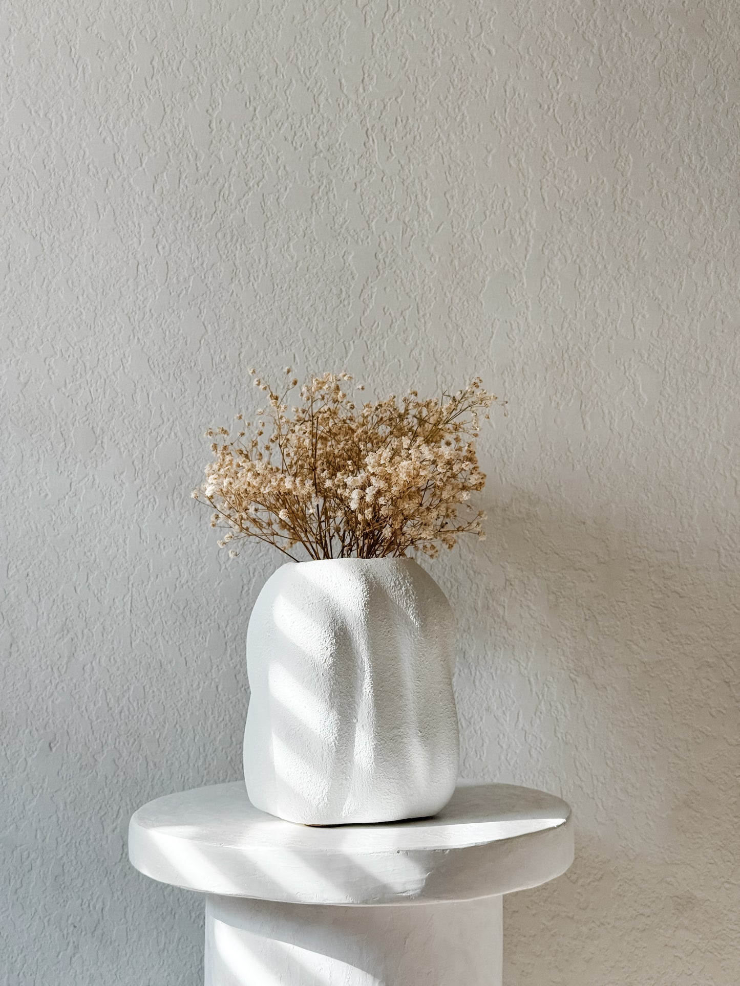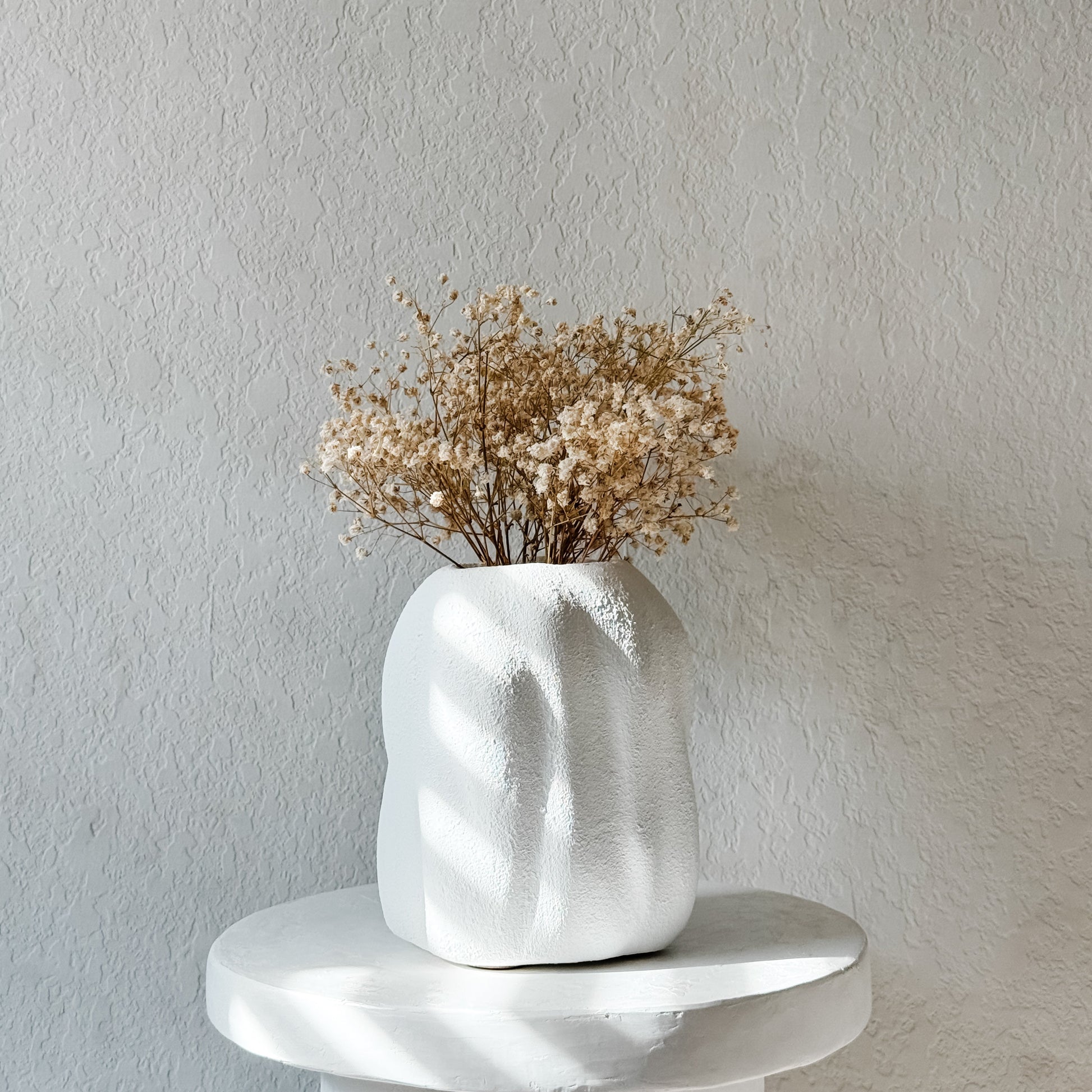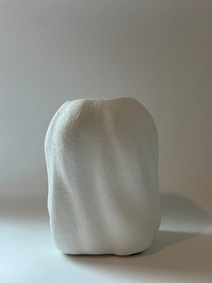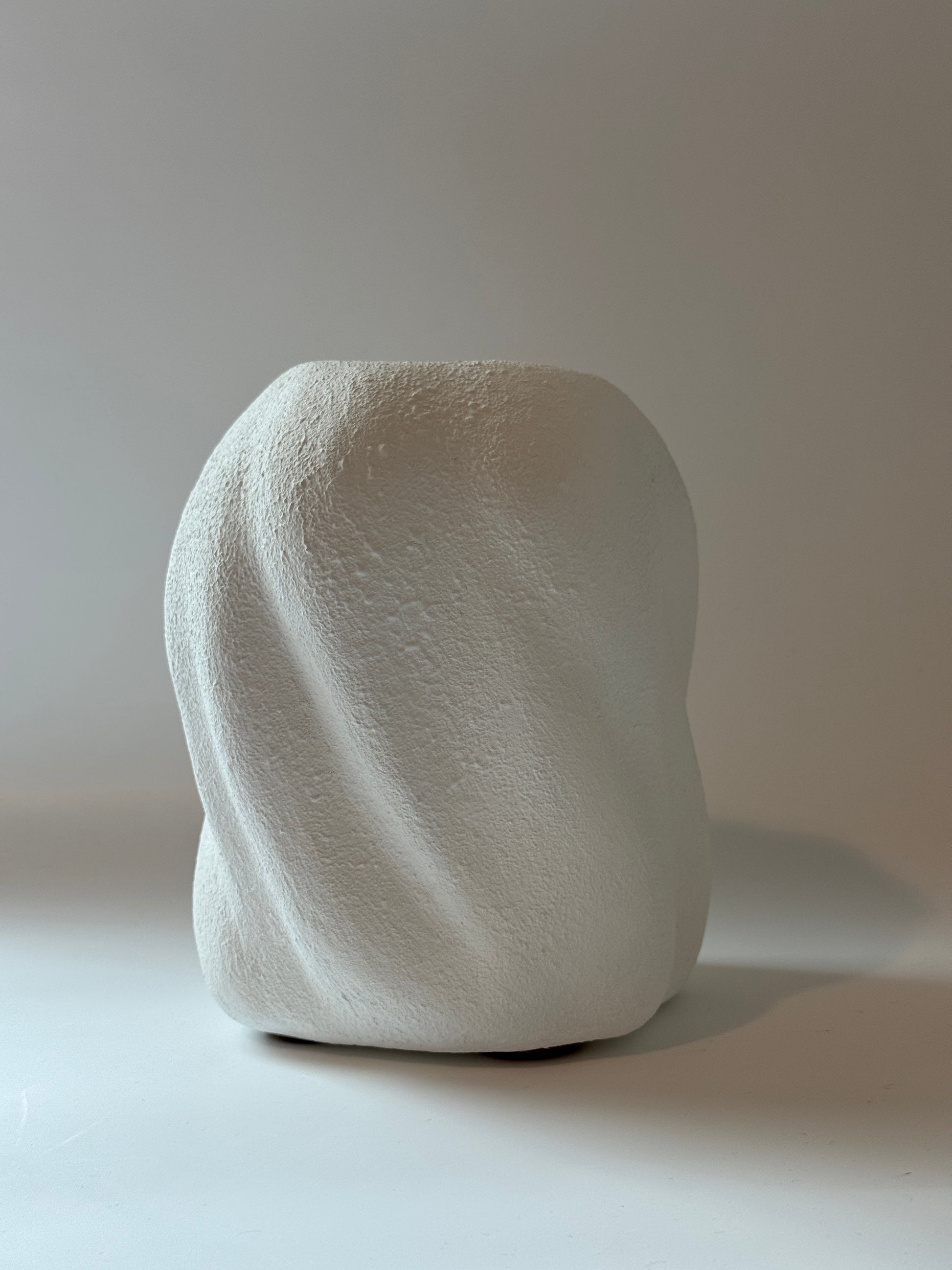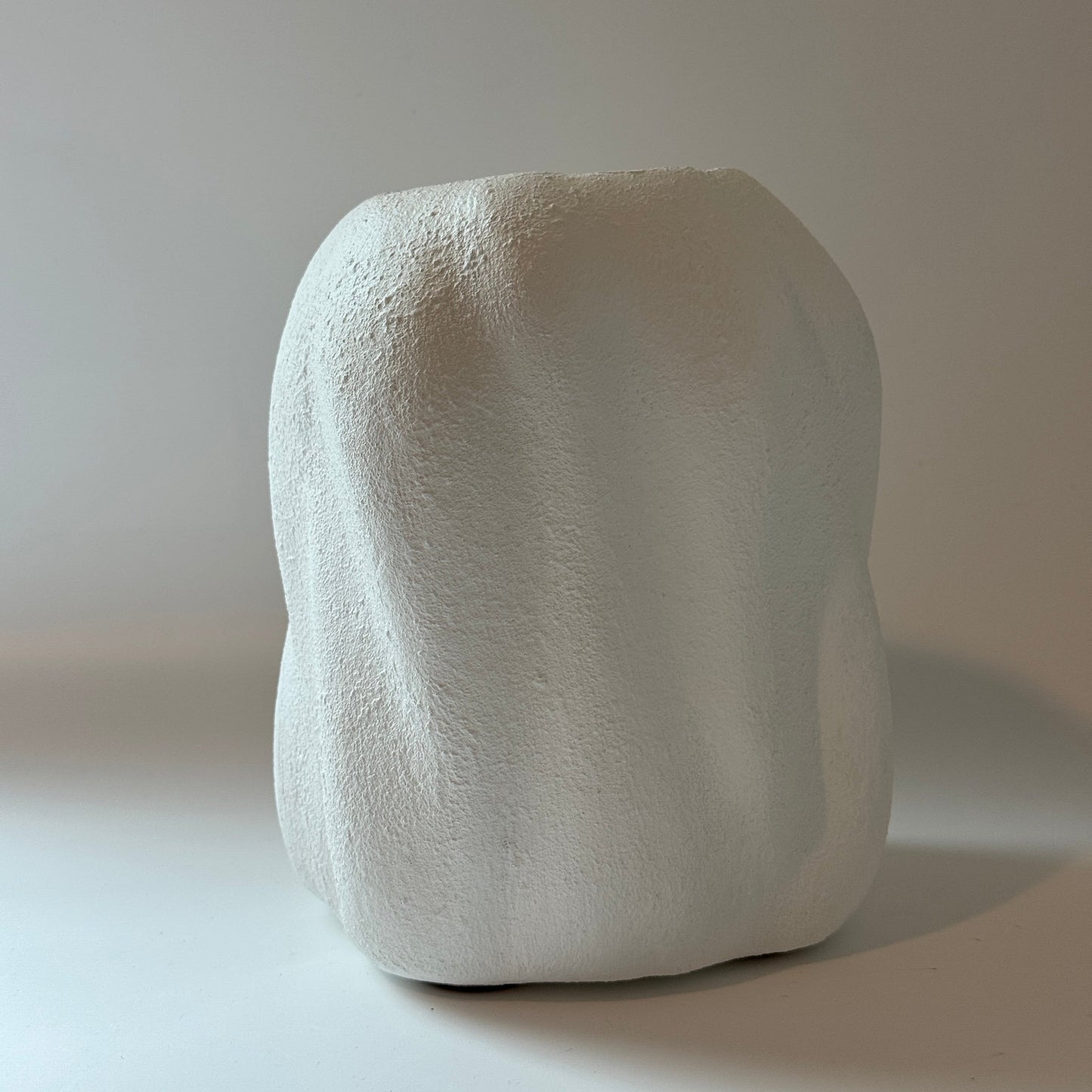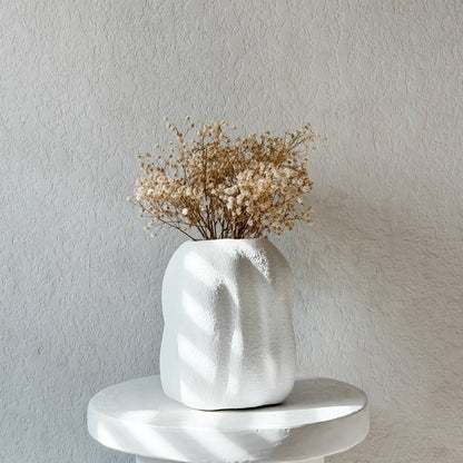 Shaped with soft, organic curves, this vase embodies a calming and fluid presence. Its undefined yet harmonious form conveys serenity, inviting the eye to rest on its gentle movement. The matte white textured finish enhances its purity, making it a timeless decorative piece that carries both elegance and quiet strength.